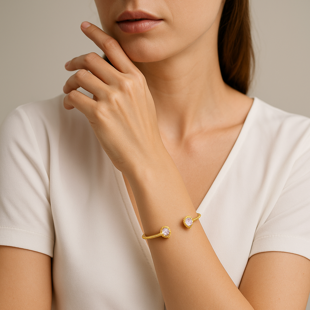 Elevate any look with this Amethyst Halo Cuff Bracelet. Crafted from stainless steel, the open-ended band features two pear-cut amethyst stones, each framed by a delicate halo of micro-pave crystals. Its slim, flexible design gently hugs the wrist for a custom fit, while the soft lavender hue adds a touch of modern elegance. Wear it solo for a minimalist statement or layer it alongside your favorite bangles to enhance both casual and evening ensembles.