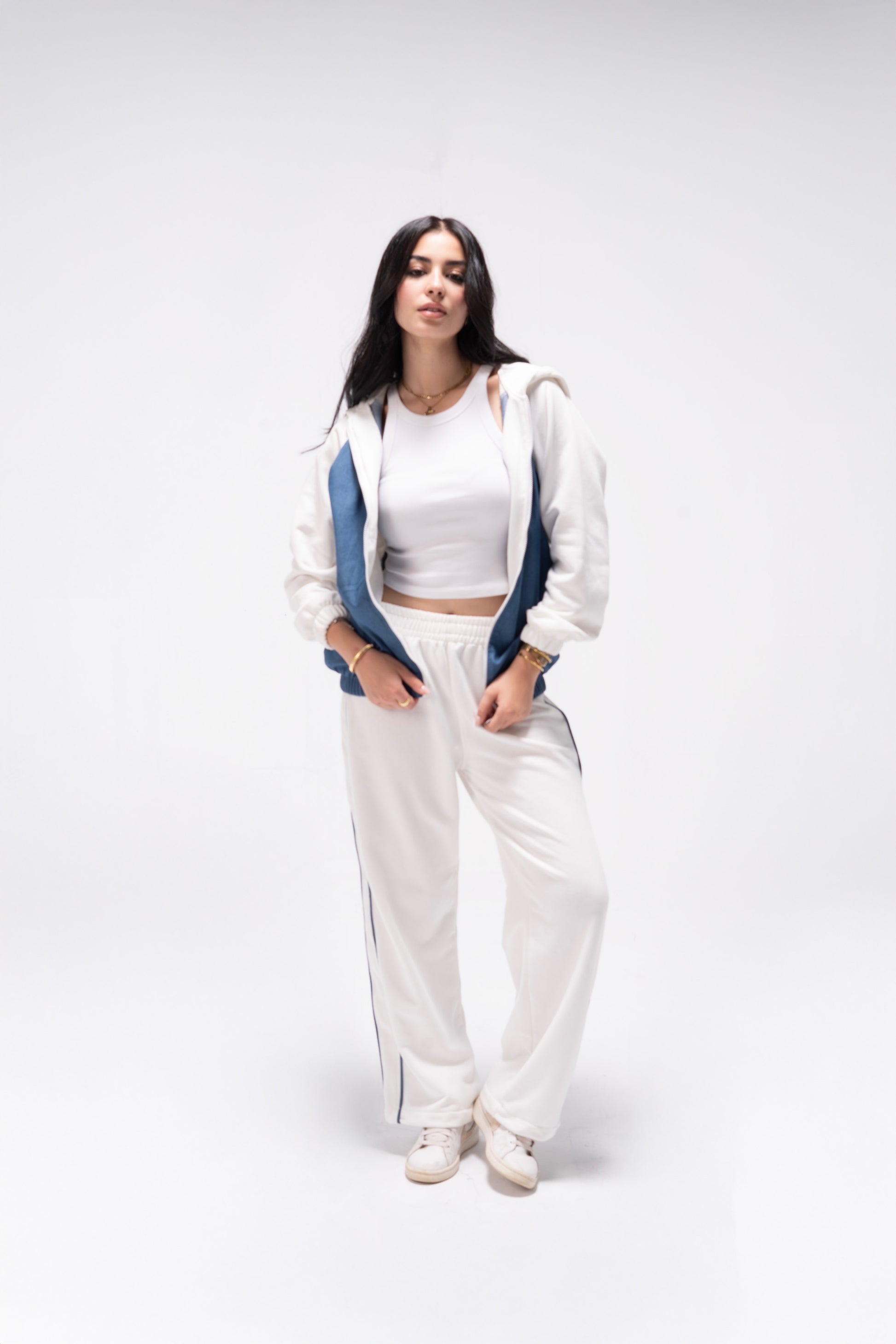 Available in three timeless colorways – Black & Blue, White & Blue, and Grey & Blue – it’s the perfect balance of athleisure and everyday elegance. Whether you’re lounging, running errands, or meeting friends, the Trio Vibe Set keeps you looking polished and relaxed all day.