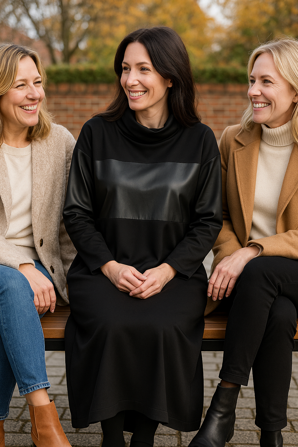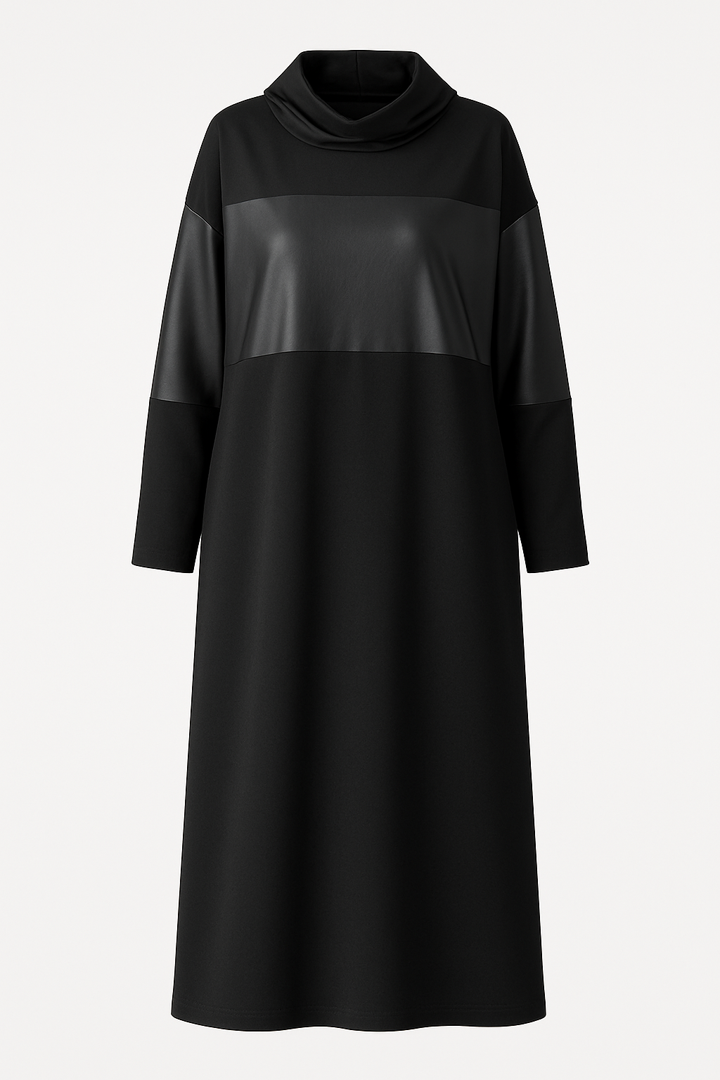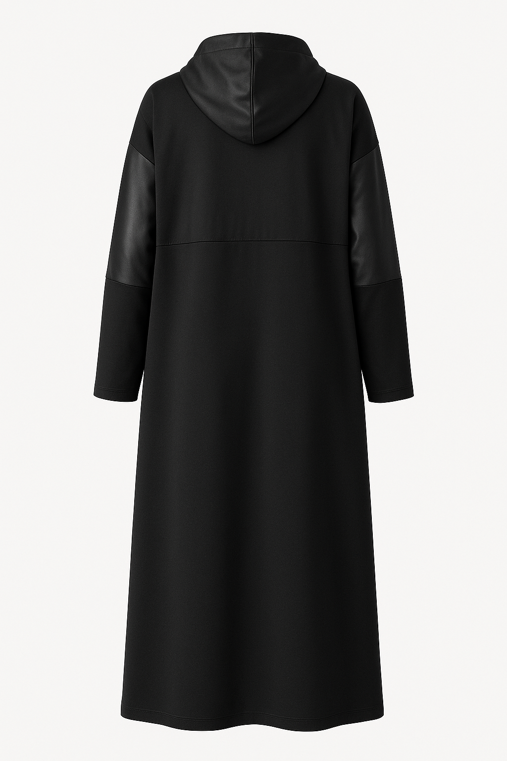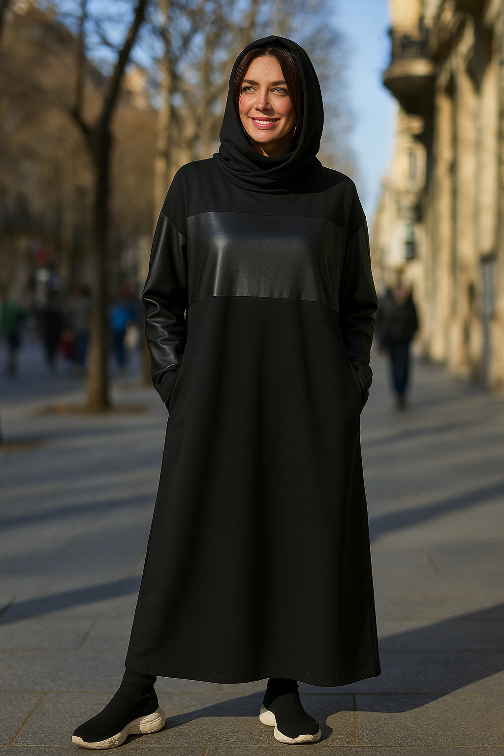 Step into effortless elegance with this black contrast maxi dress, crafted from summer melton 100% cotton fabric for breathable comfort. The design features a sleek leather touch panel and sleeves, adding a modern edge to its modest silhouette. With its relaxed fit and hood detail, this versatile piece combines chic style with everyday ease.