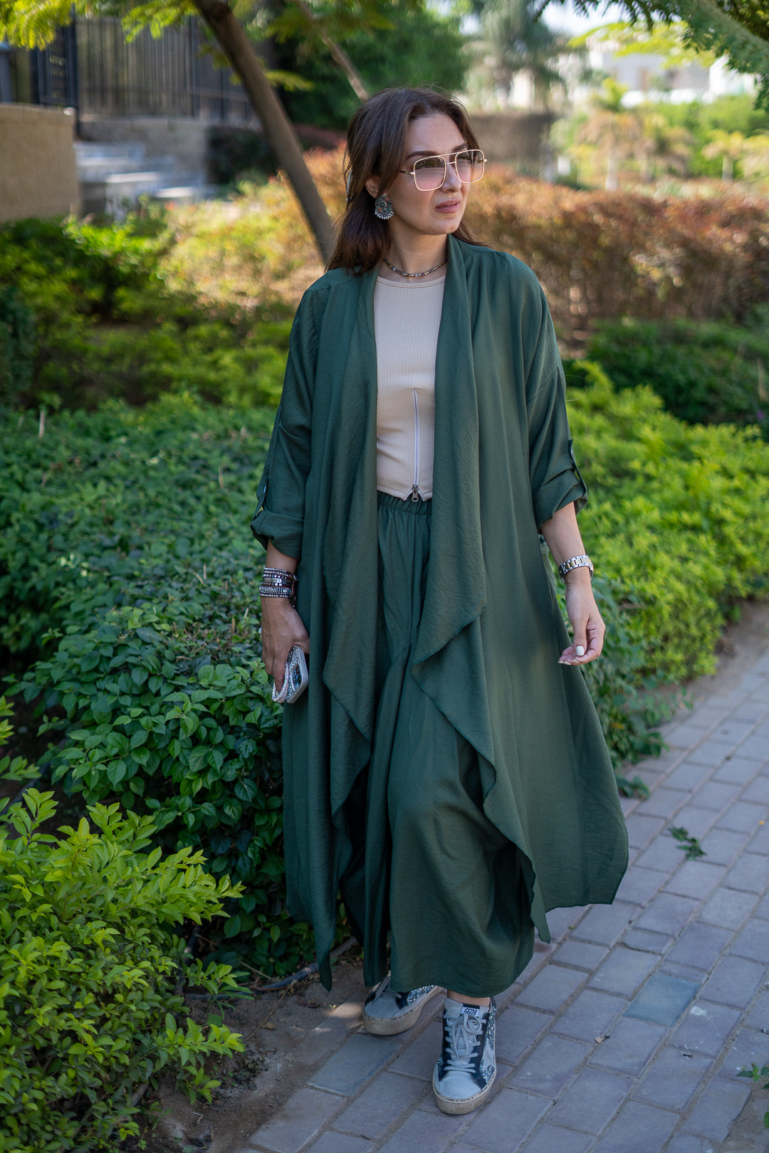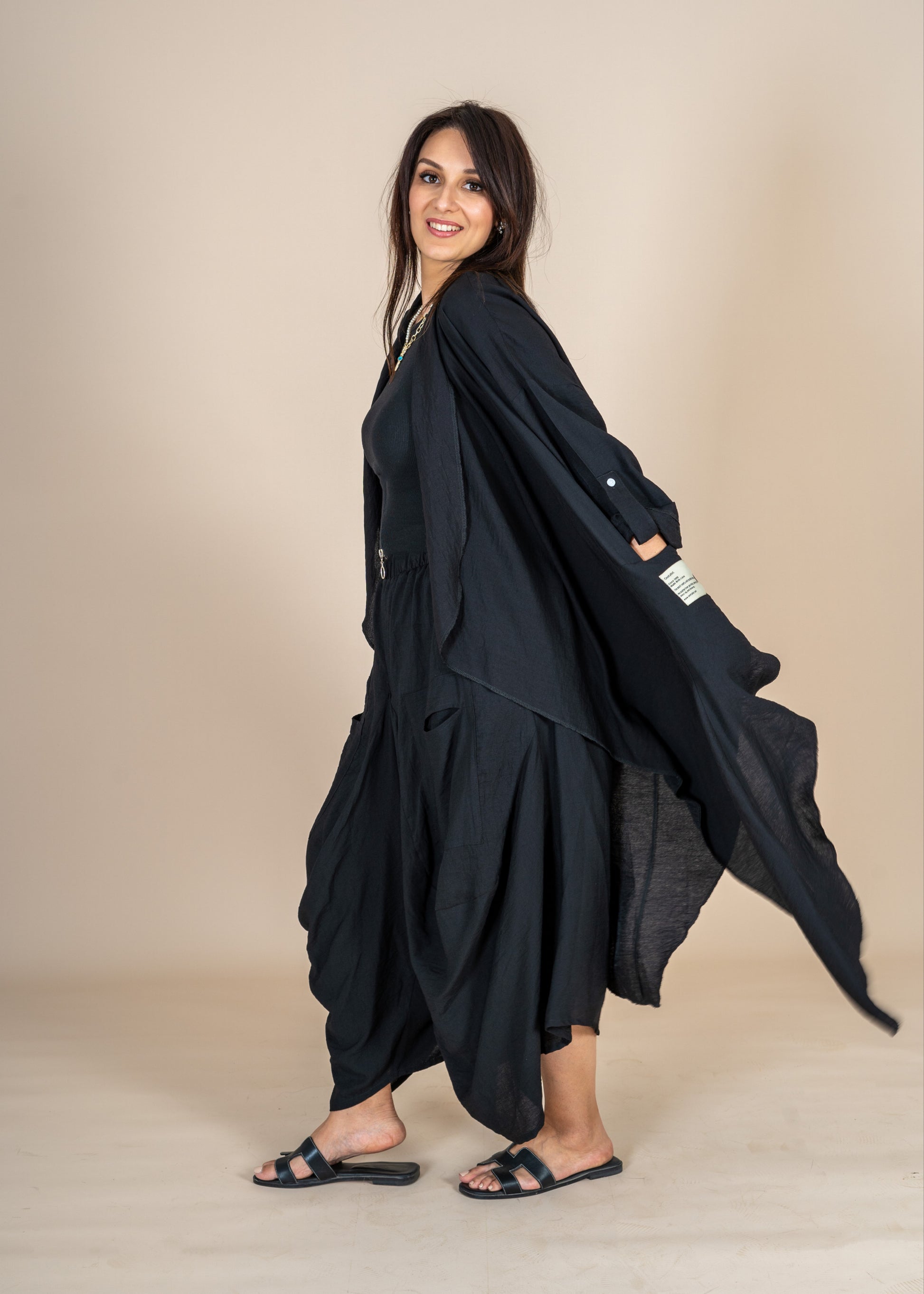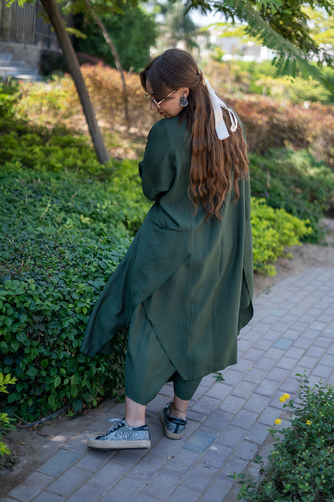 Stand out in this uniquely designed cardigan and pants set, where comfort meets artistic flair. The cardigan features a relaxed fit with distinctive lines and deep pockets for everyday ease, while the pants bring a modern twist with a sherwal-inspired cut and front pockets. Effortless, functional, and full of personality—perfect for women who love to express their style with confidence.